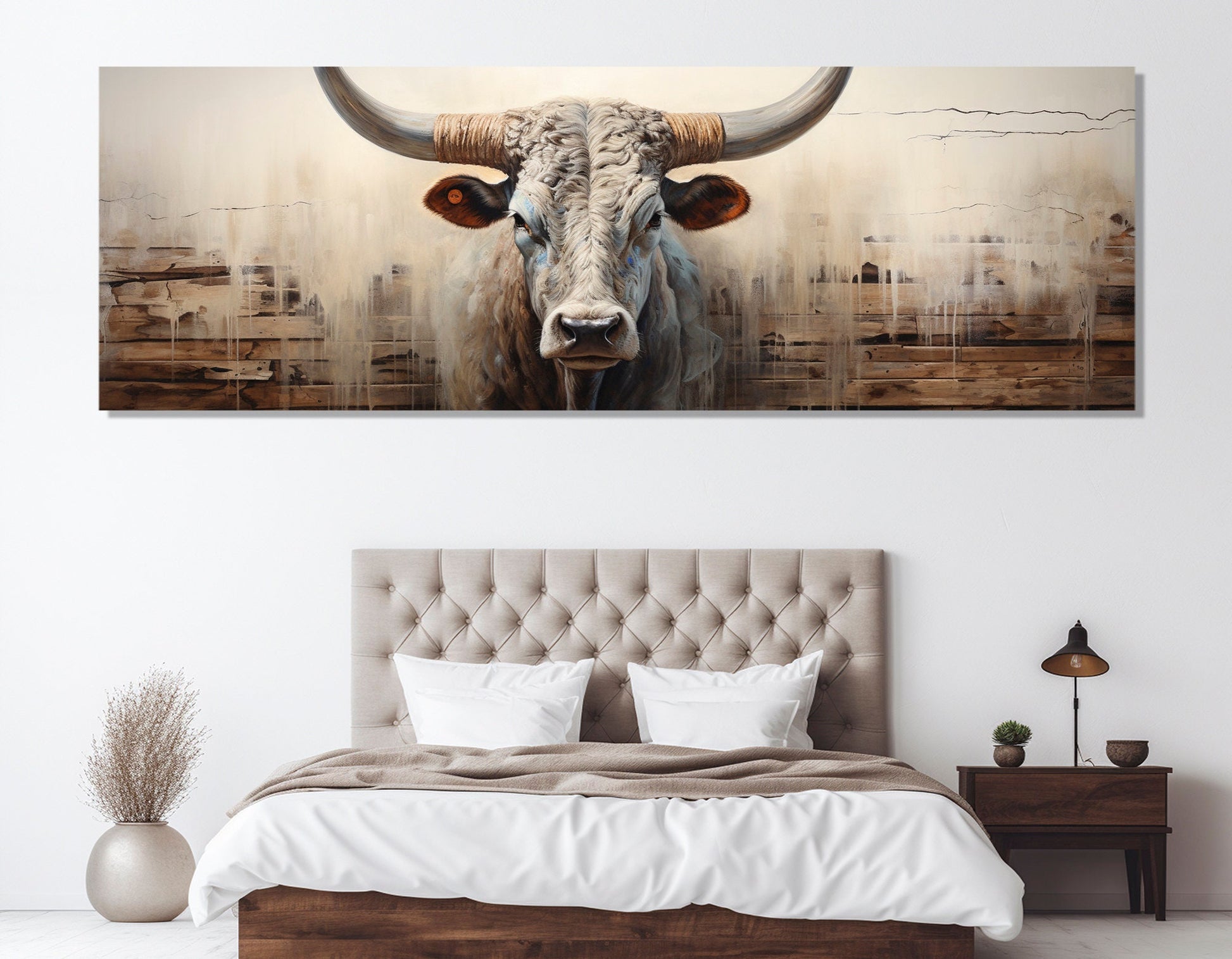 The Longhorn Cow Canvas is a stunning piece of abstract cow art designed to bring a serene, nature-inspired decor element into your home. This large cow painting features a light brown cow portrait rendered in modern wall decor style, printed on premium cotton canvas print that is gallery wrapped and stretched over a sturdy wooden frame. Perfect for farmhouse wall art lovers, this framed canvas print arrives ready to hang, transforming any living room or bedroom with its calming presence and sophisticated look.