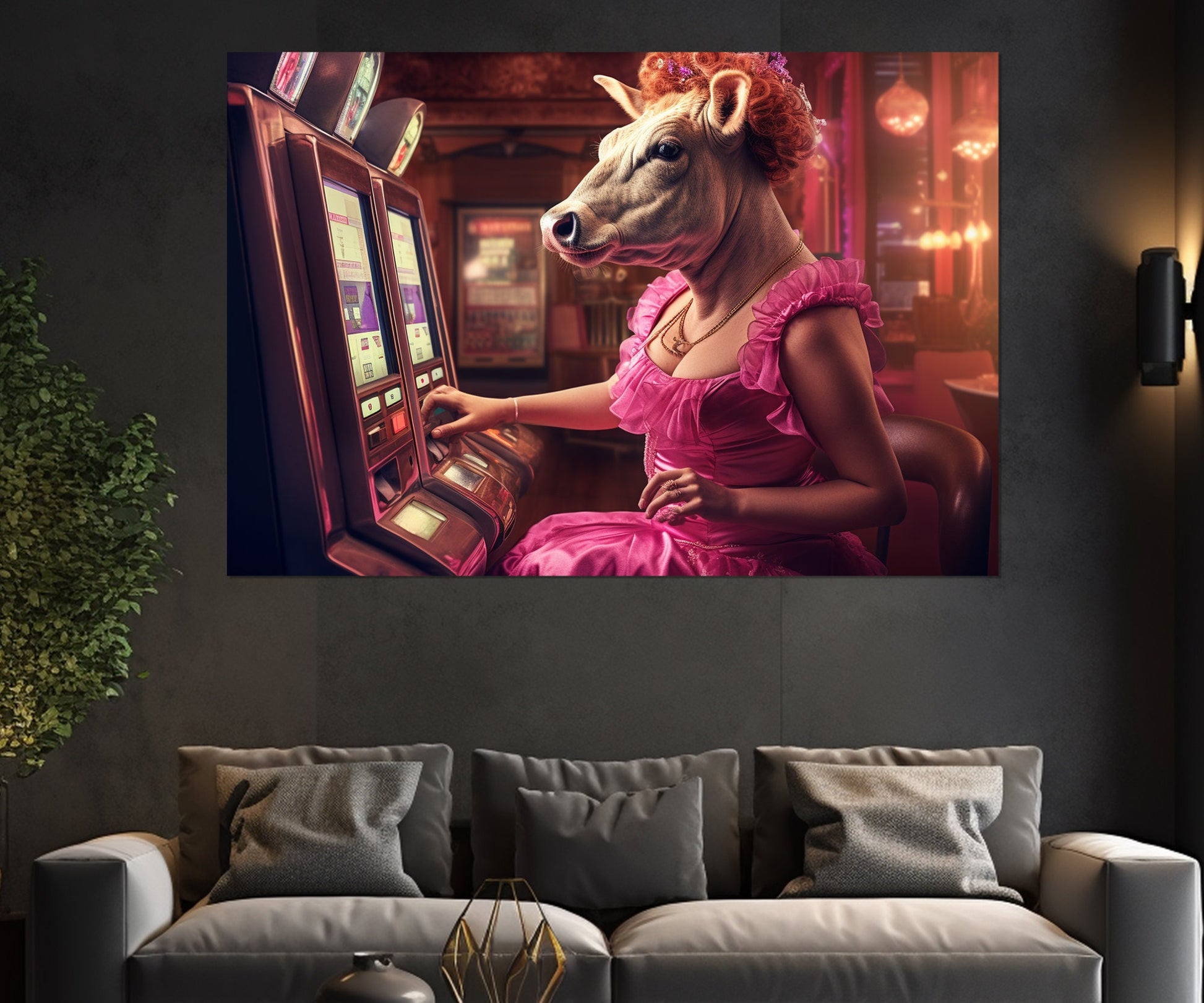 Casino Wall Art - Cow Playing Slots Print | Framed Canvas Ready to Hang