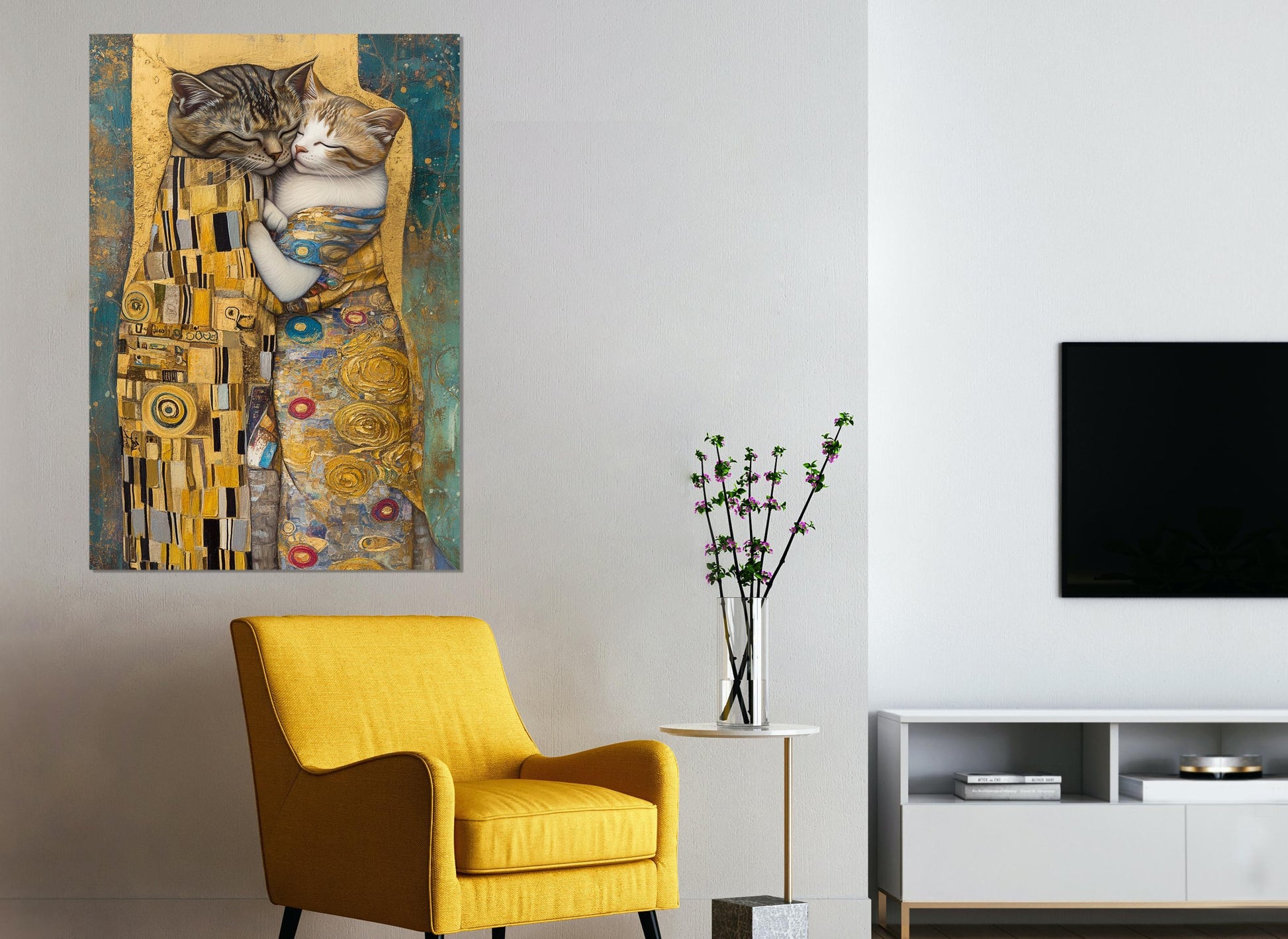 Cats Kiss Canvas Print - Gustav Klimt Style Romantic Cat Painting, Framed Art