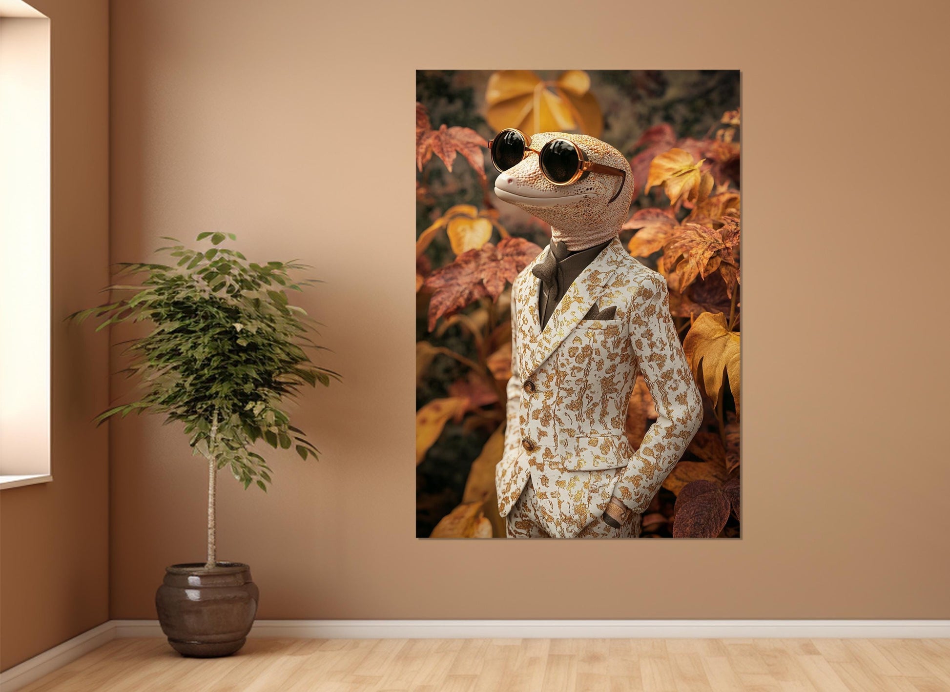 The Gecko Canvas Print adds a vibrant touch of quirky home decor to any space, featuring a gecko in a suit and sunglasses that instantly livens up your walls. This high quality canvas wall poster delivers sharp details and vivid colors on 350 gr/m2 100% cotton canvas, ensuring durability and long-lasting beauty. Ideal as funny wall art or party wall decor, this gecko in sunglasses print brings a unique modern animal art style that transforms rooms with personality and charm.