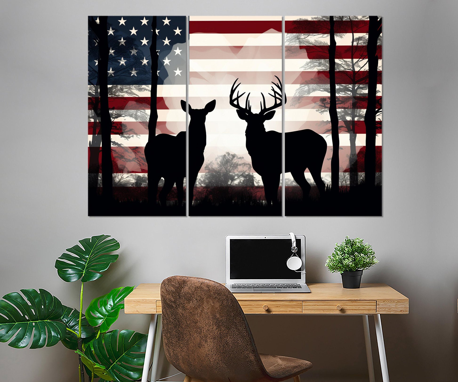 The Deer Family Canvas Print showcases a striking deer silhouette art set against a bold USA flag canvas background, designed to bring patriotic deer decor into your home or hunting lodge. This large canvas print combines rustic farmhouse decor charm with American wildlife art, creating a framed wall art piece that is both visually captivating and meaningful. Crafted with eco friendly inks, this ready to hang canvas ensures vibrant colors and durability for years to come.