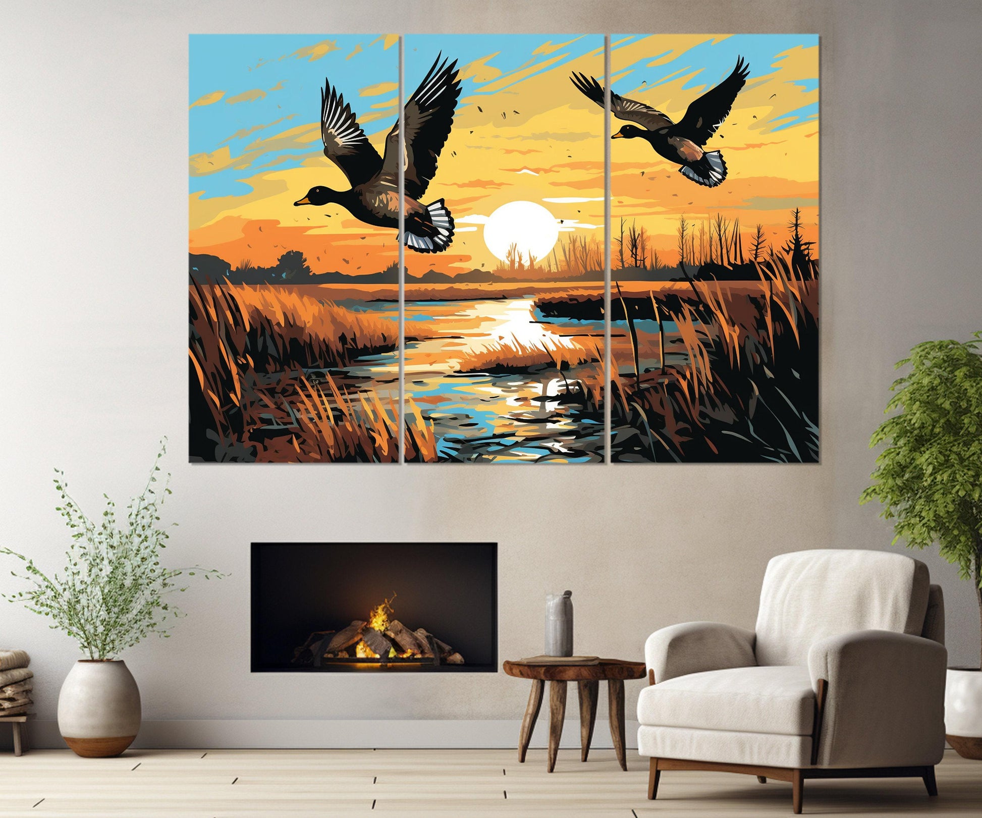 Shop confidently knowing there are no extra fees for U.S. customers — all import duties and taxes are covered so your ducks canvas print arrives just like a domestic shipment with no surprises. Elevate your interior decor with this exquisite wildlife wall art that captures the peaceful essence of duck hunting at sunset.
