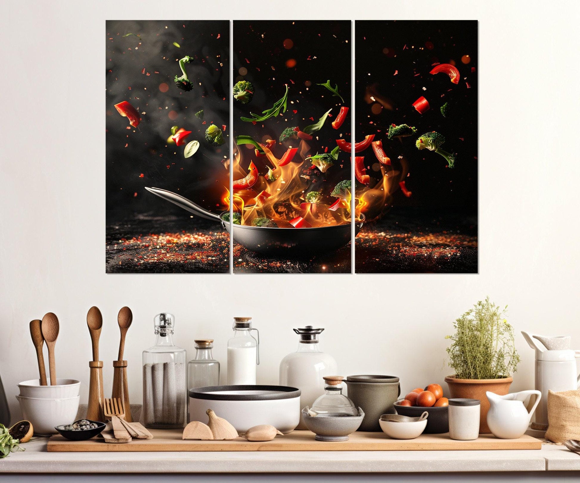 This frying pan canvas print is a stunning kitchen wall decor piece designed to elevate your cooking space with modern kitchen artwork that inspires. Crafted on high quality cotton canvas, this framed canvas art offers vivid colors and sharp details to bring warmth and style to any kitchen. Measuring from 24"x16" (60x40 cm) up to 82"x54" (210x140 cm), this gallery wrapped canvas is available as a single panel or multi panel canvas set, making it perfect for kitchens of all sizes. The ready to hang artwork arrives fully assembled on a 1.3" (3cm) thick wood frame, so you can easily add a decorative cooking poster that enhances your home or restaurant wall art instantly.