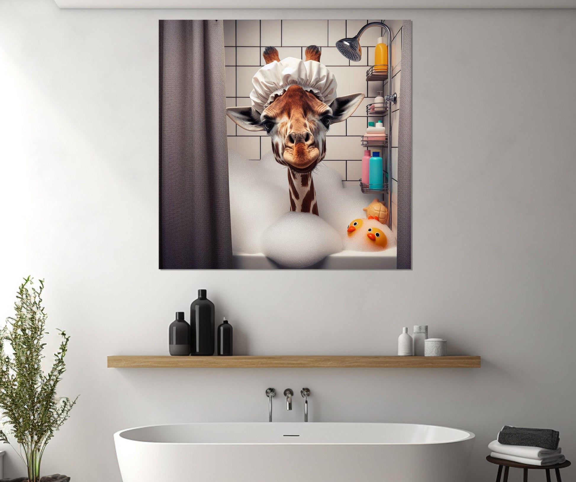 Giraffe bathroom art brings a playful animal art touch to your space, perfect for brightening up any kids bathroom decor or nursery wall decor. This cute animal canvas features a charming giraffe design printed on high-quality 100% cotton canvas with eco friendly inks, ensuring vibrant colors and safe materials for your baby room art or childrens room decor. The gallery wrapped art is stretched over a sturdy 1.3" (3cm) thick wood frame canvas, ready to hang with no additional framing required.