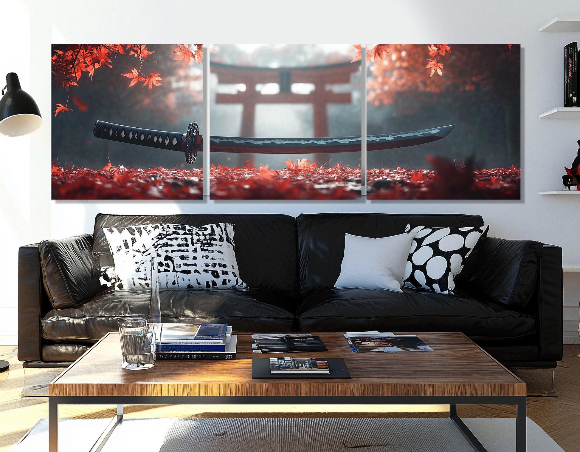 This Japanese katana canvas print brings authentic samurai sword art directly to your living space, transforming your room with striking Japanese wall decor that highlights the iconic torii gate print and samurai sword painting. Crafted on high-quality 100% cotton canvas, this gallery wrapped canvas ensures durability and vivid colors for long-lasting enjoyment. With a lifetime guarantee indoors, this framed canvas art is ready to hang and elevates any space with its unique Asian wall artwork.