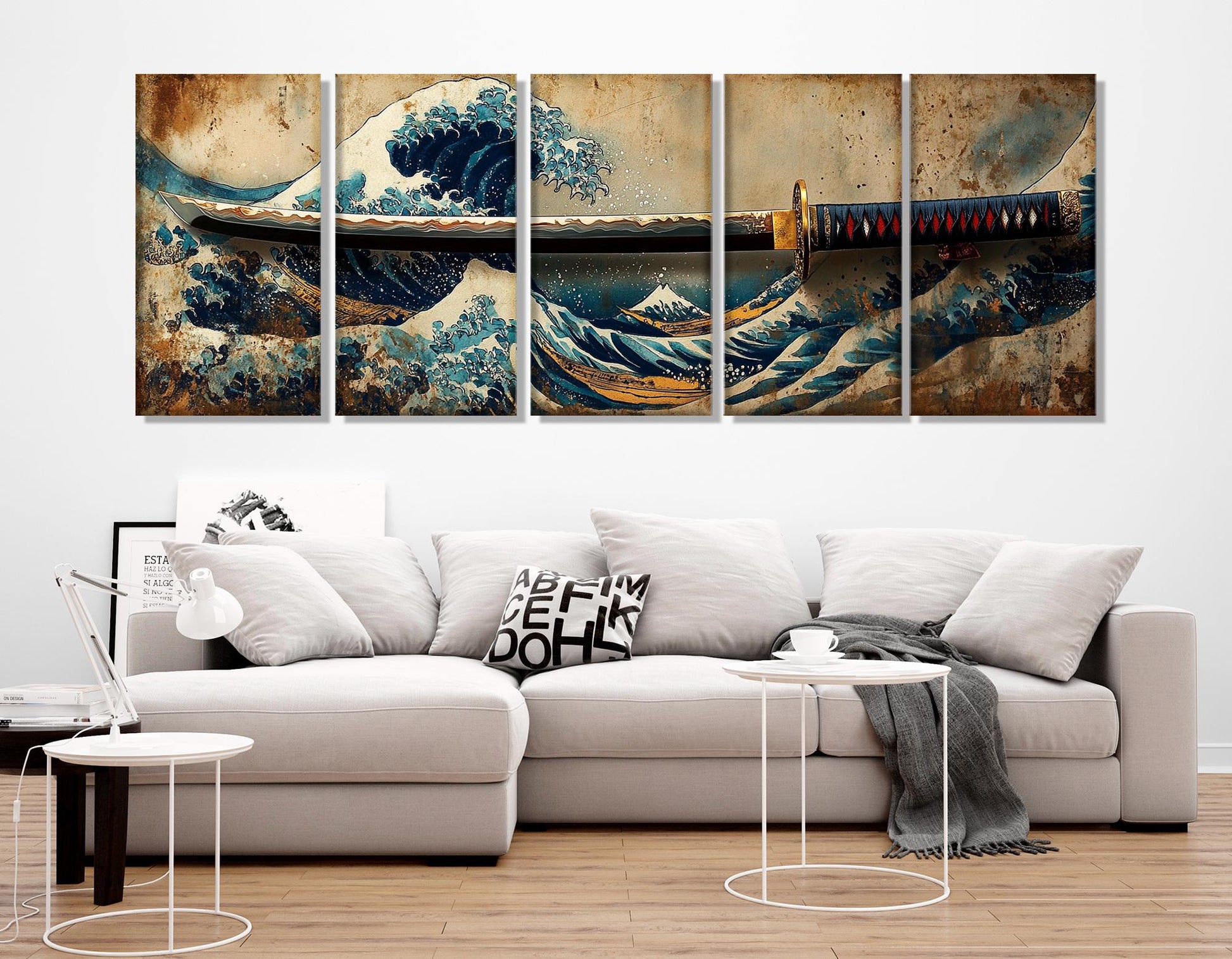 This Scenic Japanese Wall Art features a striking samurai sword canvas alongside the iconic Great Wave print, delivering vintage Japanese painting aesthetics that transform any space with traditional Japan art. Crafted on premium 350 gr/m2 100% cotton canvas, this framed canvas art comes ready to hang and offers a lifetime guarantee for indoor use. The Japanese wall art uses solvent-free HP Latex inks certified by UL ECOLOGO® and GREENGUARD GOLD, ensuring vibrant, eco-friendly colors that last.