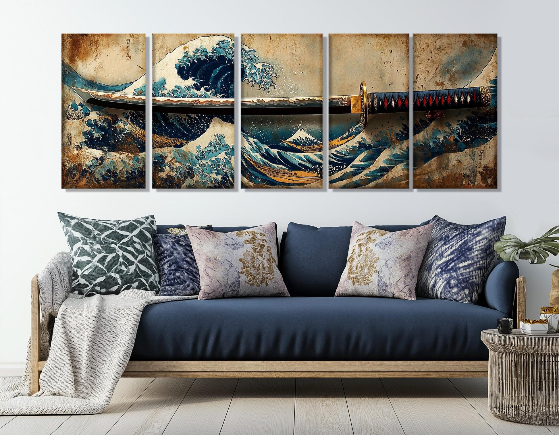 Japanese Wall Art – Samurai Sword Canvas with Great Wave Print | Framed Canvas Art Ready to Hang