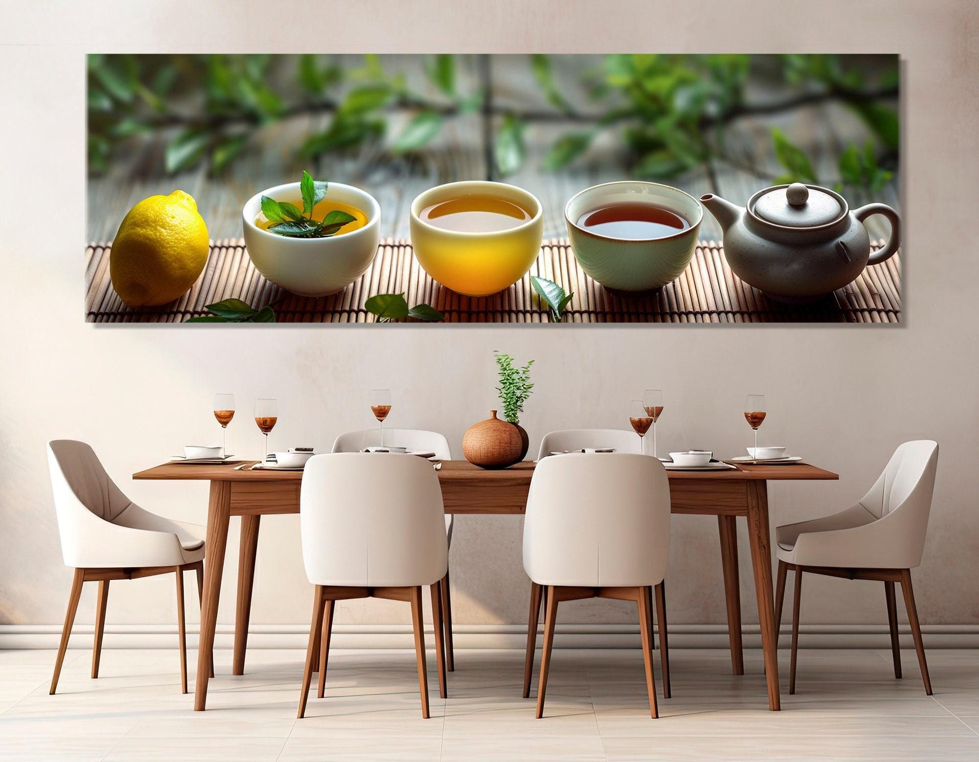 This Large Tea Canvas Print brings elegant kitchen wall art that transforms any cooking space into a serene tea ceremony painting experience. Designed for tea lovers seeking refined tea wall decor, this framed canvas art offers a premium cotton canvas print that delivers vibrant colors and durable quality. Measuring from 24"x8" (60x20 cm) up to 72"x24" (180x60 cm) for single panels, or available as multi panel canvas sets reaching up to 130"x43" (330x110 cm), this large tea poster fits perfectly in kitchens or dining areas to enhance ambiance and style.