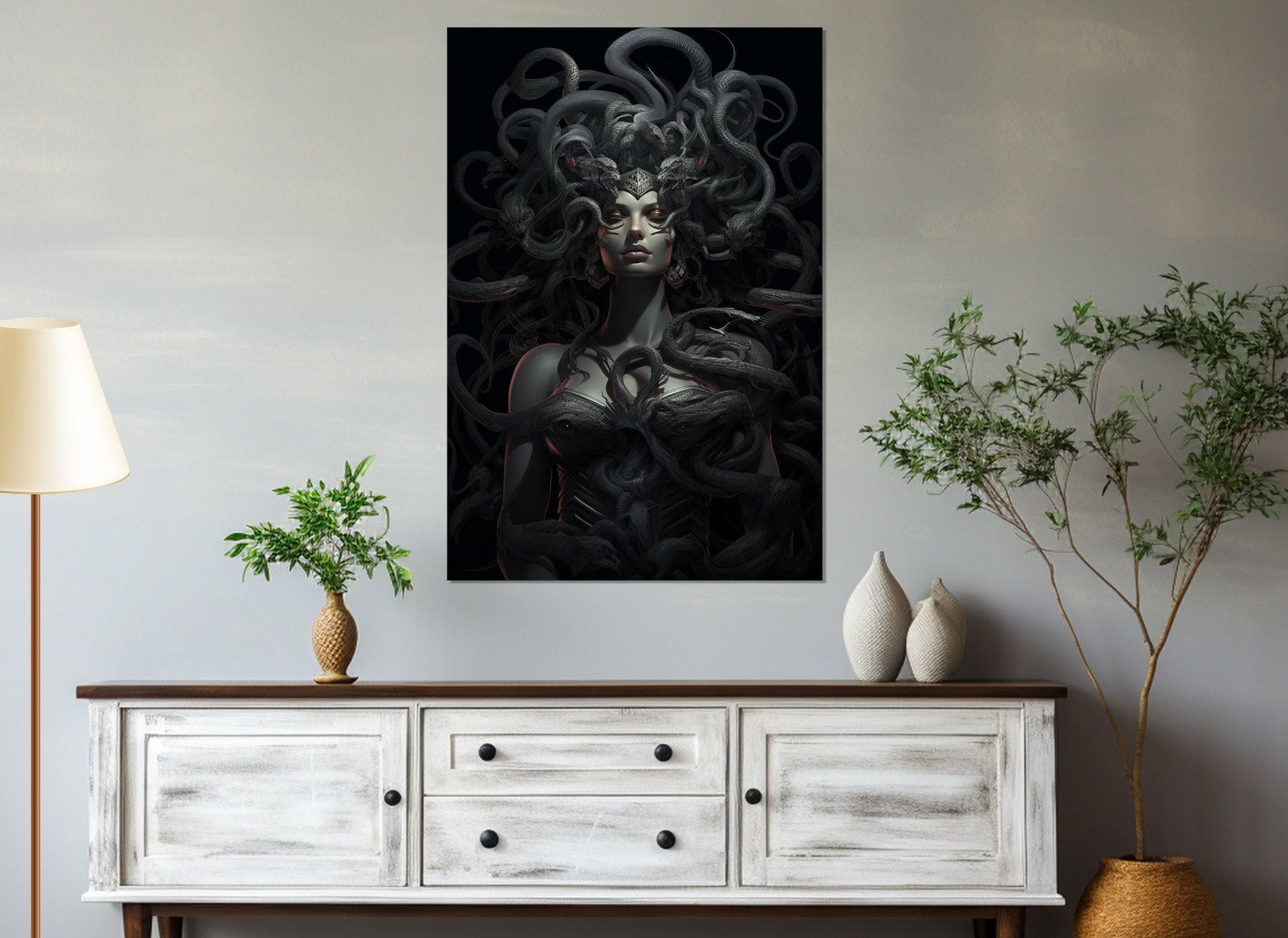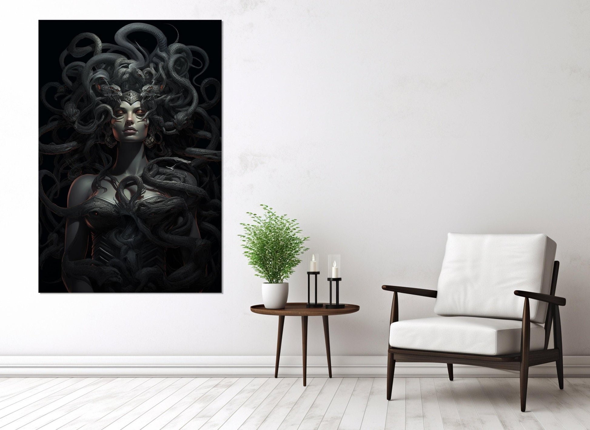 Elevate your interior design with this Medusa canvas print that combines timeless mythology wall art with modern craftsmanship. Whether as a statement piece in your living room or an eye-catching decoration in your office, this framed canvas art delivers both aesthetic appeal and lasting quality.