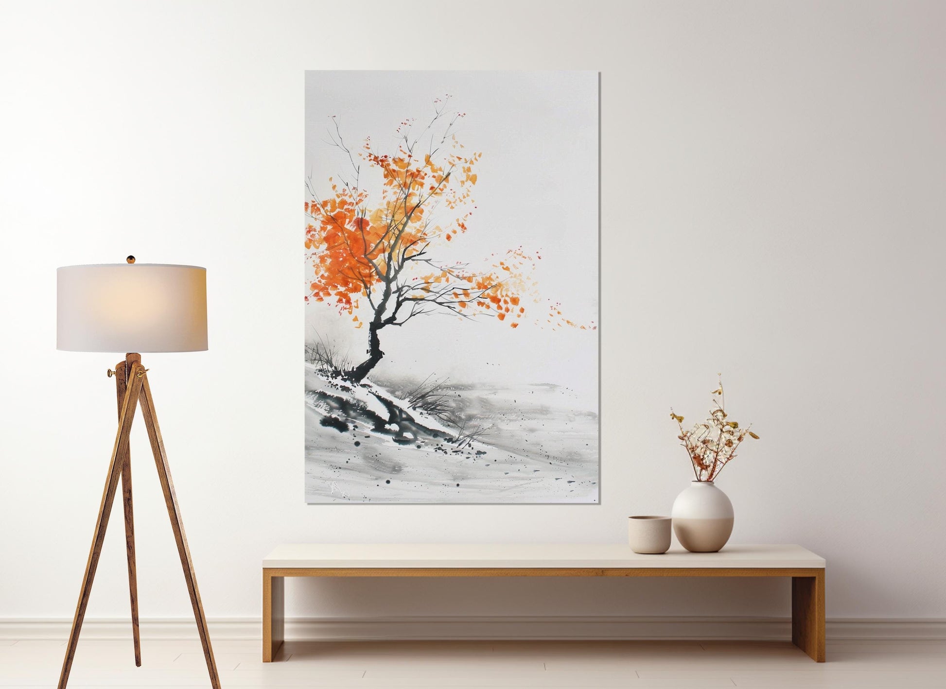 Minimalist Autumn Tree Painting – Japanese Wall Decor | Framed Canvas Art Ready to Hang