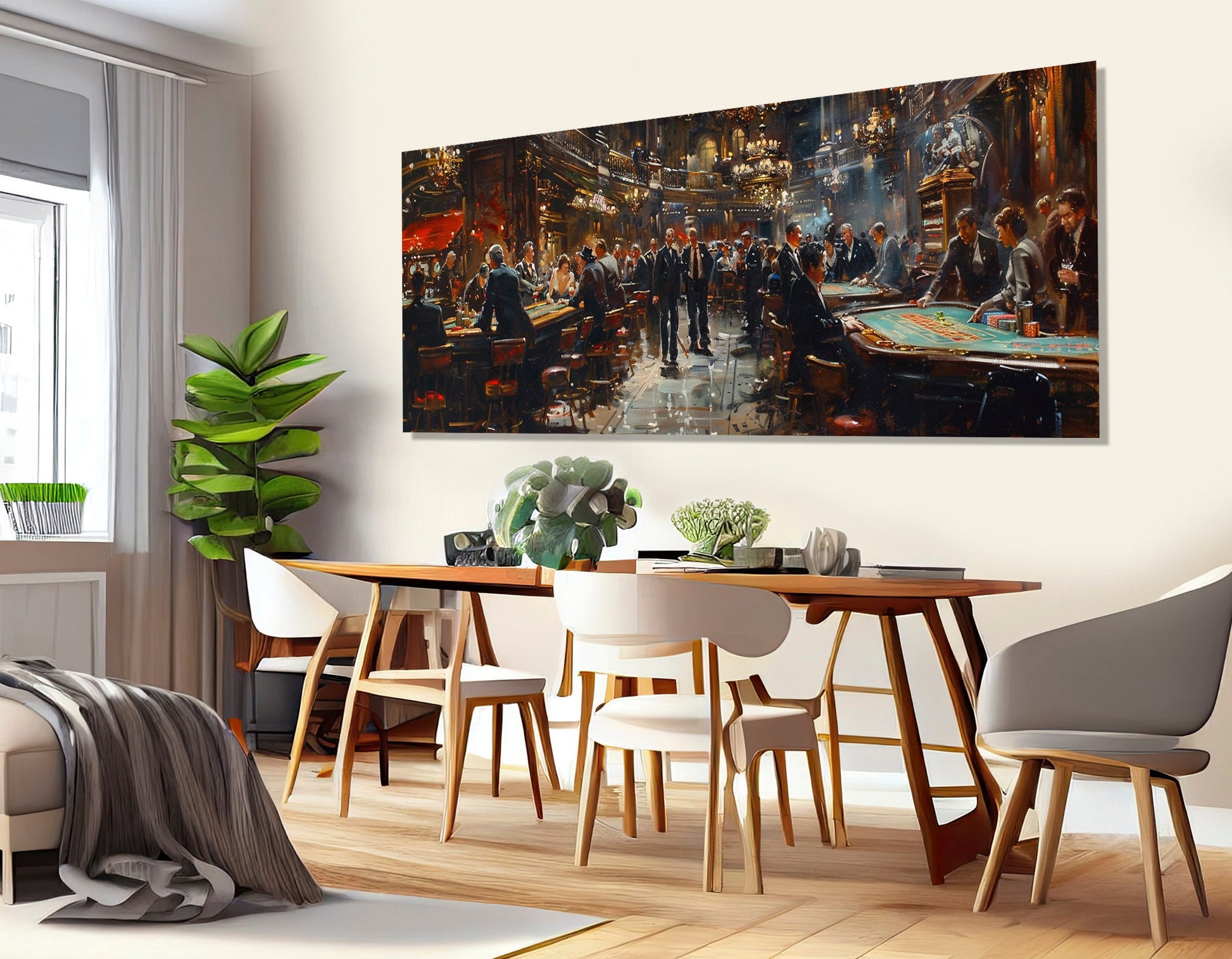 This vintage casino print is printed on 350 gr/m2 100% cotton canvas using solvent-free, allergen-free HP Latex Inks, certified UL ECOLOGO® and UL GREENGUARD GOLD to meet strict environmental standards. The gallery wrapped canvas is professionally stretched on a 1.25" (3 cm) deep wooden frame, while the floating frame canvas option adds a sleek 1.4" (3.5 cm) deep frame available in five colors for a sophisticated look. The multi panel canvas set options range from 3 to 5 panels, with total sizes up to 130"x43" (330x110 cm), making it easy to customize your space.