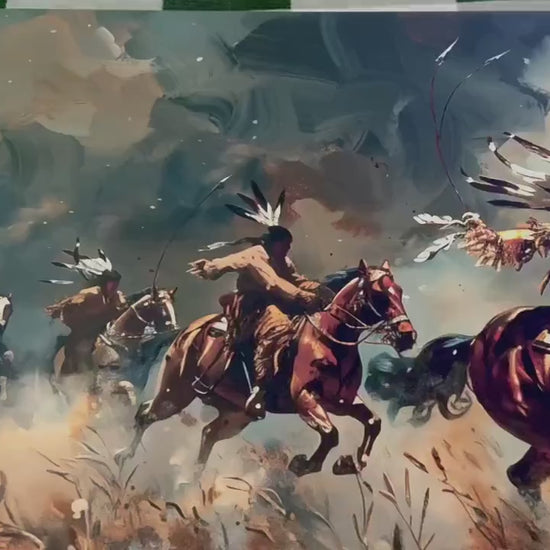 Native Americans canvas art brings the rich heritage and vibrant culture of First Nations to your living space with this stunning framed canvas print ready to hang. This tribal wall decoration features a detailed Native American horse painting that captures the spirit and tradition of indigenous peoples, offering a powerful visual impact and a unique way to honor their legacy. Crafted on high-quality 350 gr/m2 cotton canvas, this gallery wrapped canvas ensures durability and vivid color retention, making it an exceptional piece for any home or office.