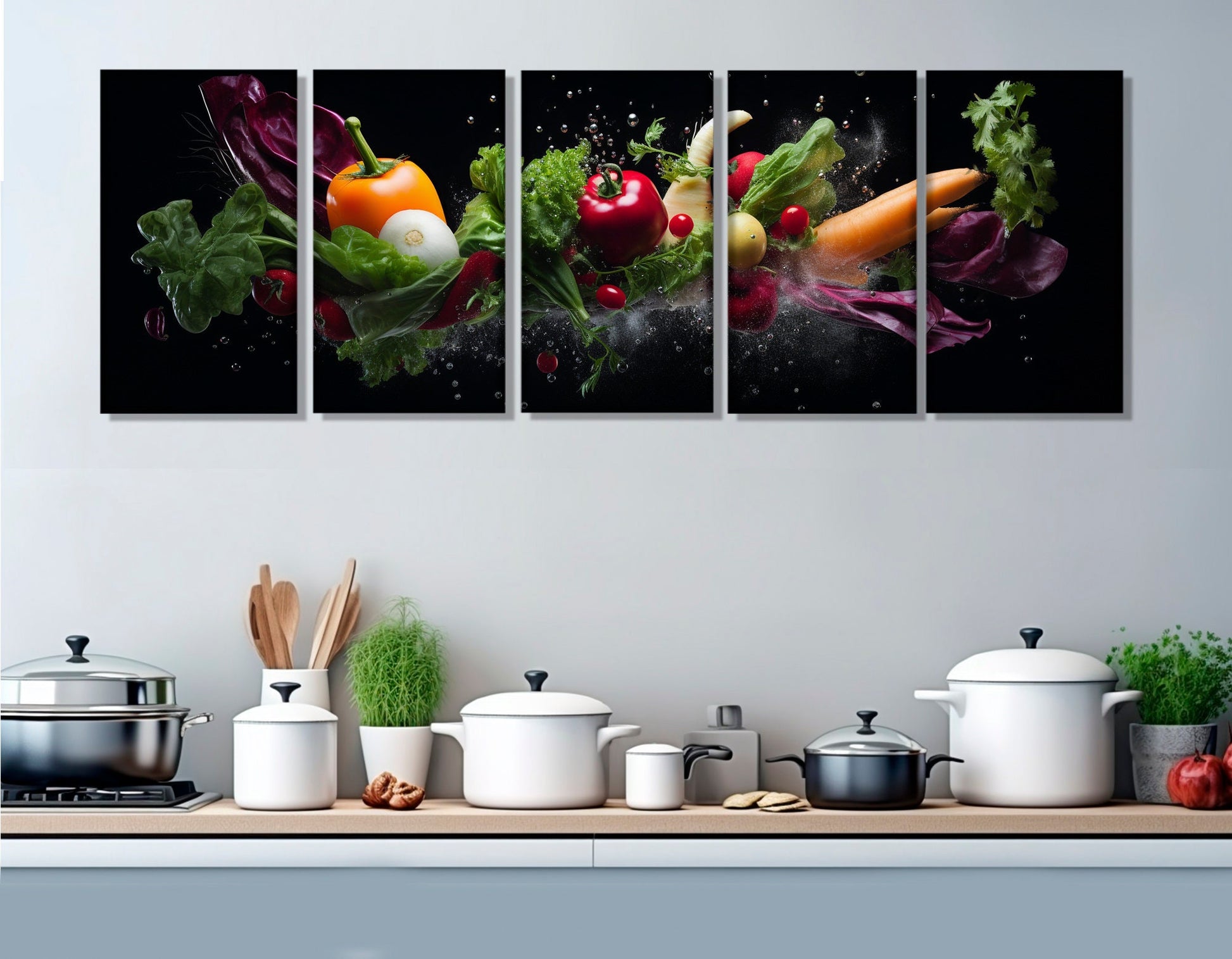 Vegetables Canvas Print brings vibrant, modern kitchen wall decor that transforms your cooking space with fresh, healthy food imagery. This framed canvas print is ready to hang and designed to enhance your kitchen wall art with a large food painting that inspires a vegan lifestyle. Crafted on high-quality 350 gr/m2 cotton canvas, this gallery wrapped canvas offers durability and vivid colors using solvent-free HP Latex inks, certified UL ECOLOGO® and GREENGUARD GOLD for safe indoor air quality.