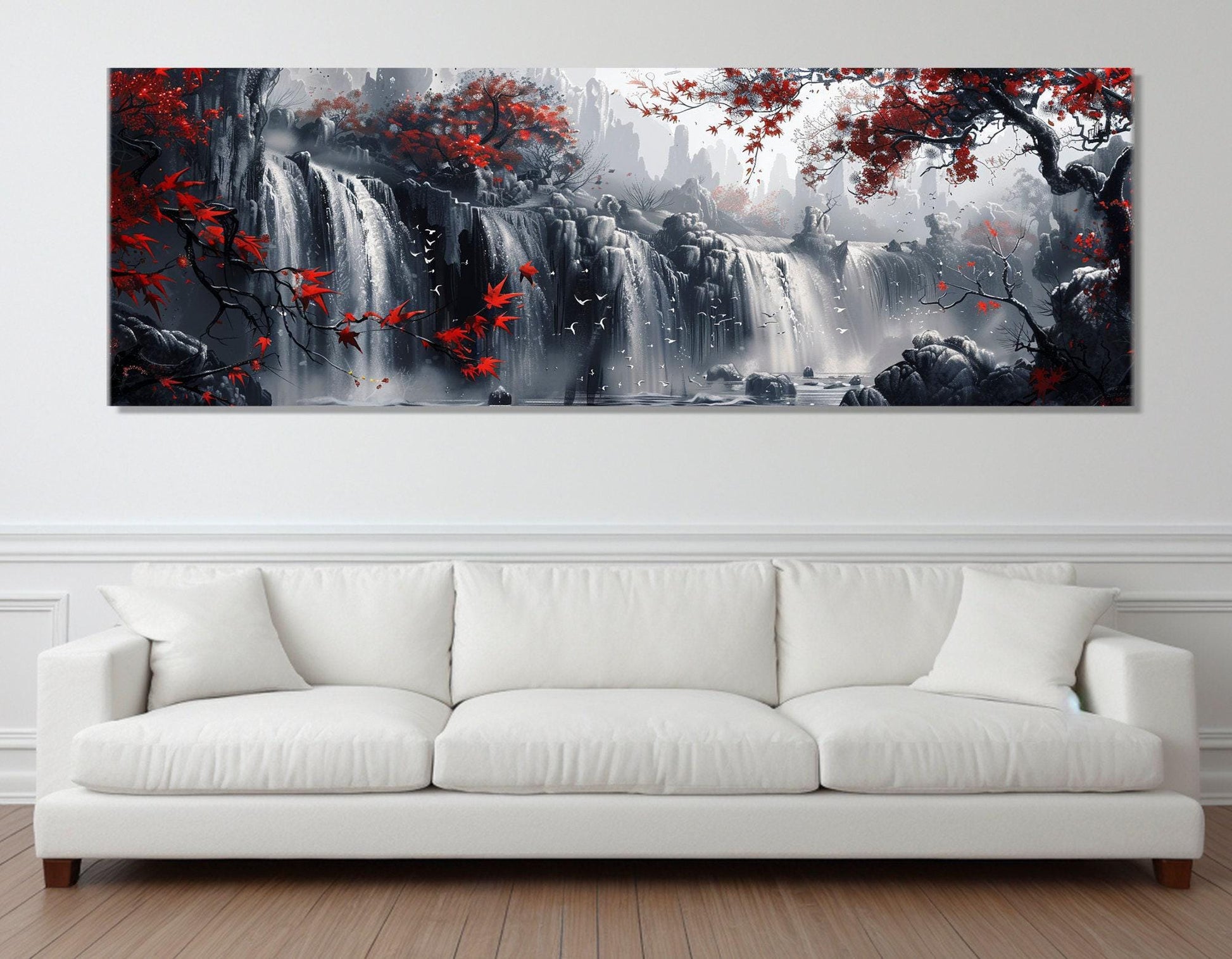 Bring home this abstract waterfall painting that combines artistic AI creation with premium craftsmanship. Whether as bedroom wall decor or a statement piece in your living area, this black white waterfall print with red trees artwork will elevate your space with timeless scenic wall art.